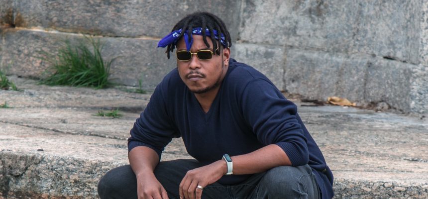 O celular da esquerda exibe a tela inicial do aplicativo, que mostra a foto de um jovem negro sorridente usando fones de ouvido grandes e azuis. O logotipo SELIGANAMÚSICA é visível na parte superior.