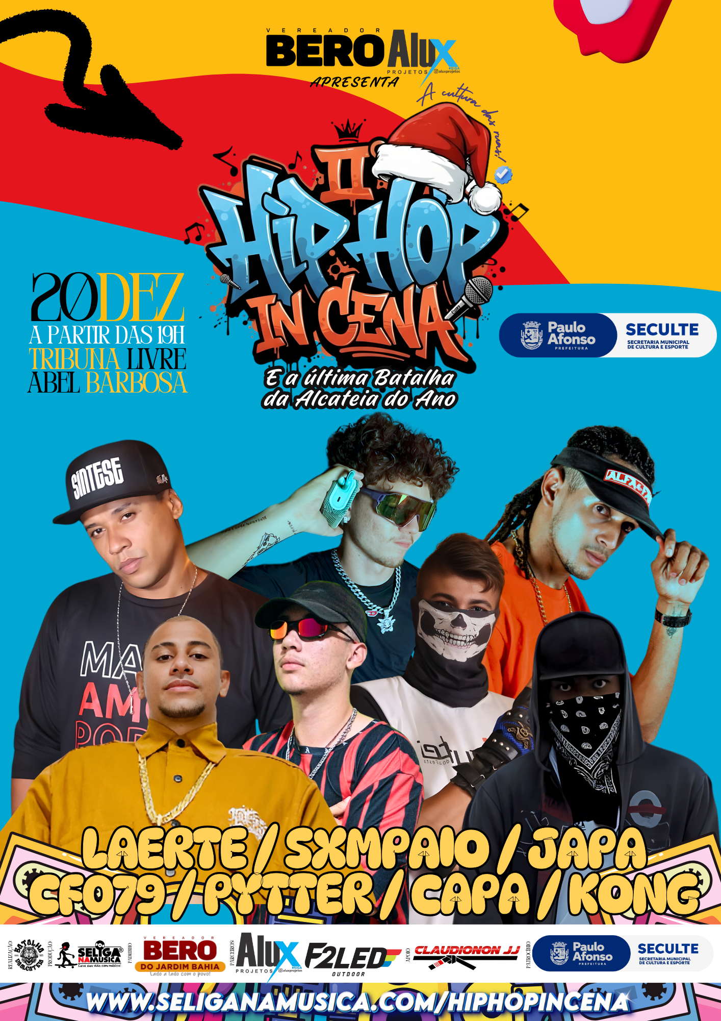 A SELIGANAMUSICA® tem como missão levar a arte local para o topo, dando protagonismo aos nossos DJs, rappers, B-boys e grafiteiros. Todos esses artistas apareceram na capa da REVISTA CONESSIONE no mês do evento! O HIP HOP IN CENA é um projeto que quer quebrar tudo em Paulo Afonso, unindo música, dança, moda, grafite e muitos outros elementos para criar um estilo urbano e único que todos possam curtir. Vem conosco!