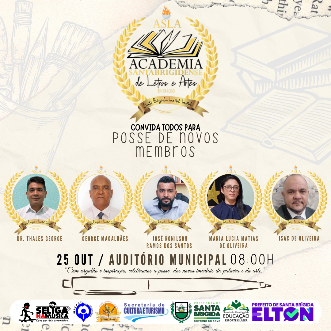 Santa Brígida (BA) – A Academia Santabrigidense de Letras e Artes (ASLA) realiza, neste sábado, 25 de outubro, a cerimônia oficial de posse dos novos membros da instituição, em um evento que promete ser um marco para a cultura local. A solenidade ocorrerá no Auditório Municipal, localizado ao lado da Prefeitura de Santa Brígida, com início às 8h da manhã e encerramento às 11h.