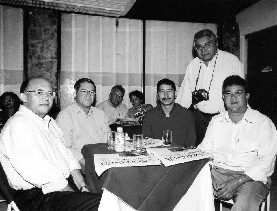 “Personalidades de Paulo Afonso no lançamento do jornal Folha Sertaneja, no CPAZINHO, em 18/02/2004. A partir da esquerda, sentados, estão: Dr. José Fernandes (OAB), Cel. Nilton (20º BPM), Erivaldo (Ascopa), Gilberto Pedrosa e Maninho (APA/Chesf). De pé, aparece Antônio Galdino. Ao fundo, também estão o prefeito de Jatobá, João Gomes, e sua esposa.”