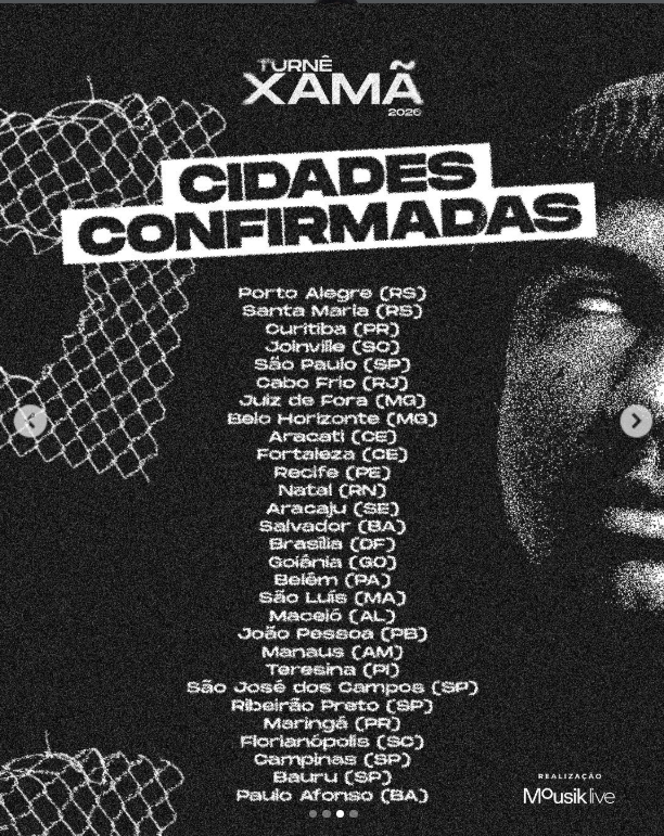 O rapper, cantor e ator Xamã anunciou oficialmente as datas da sua Turnê Xamã 2026, confirmando shows em mais de 25 cidades pelo Brasil — entre elas Paulo Afonso (BA), uma ótima notícia para os fãs da região e um marco para a música urbana na Bahia.