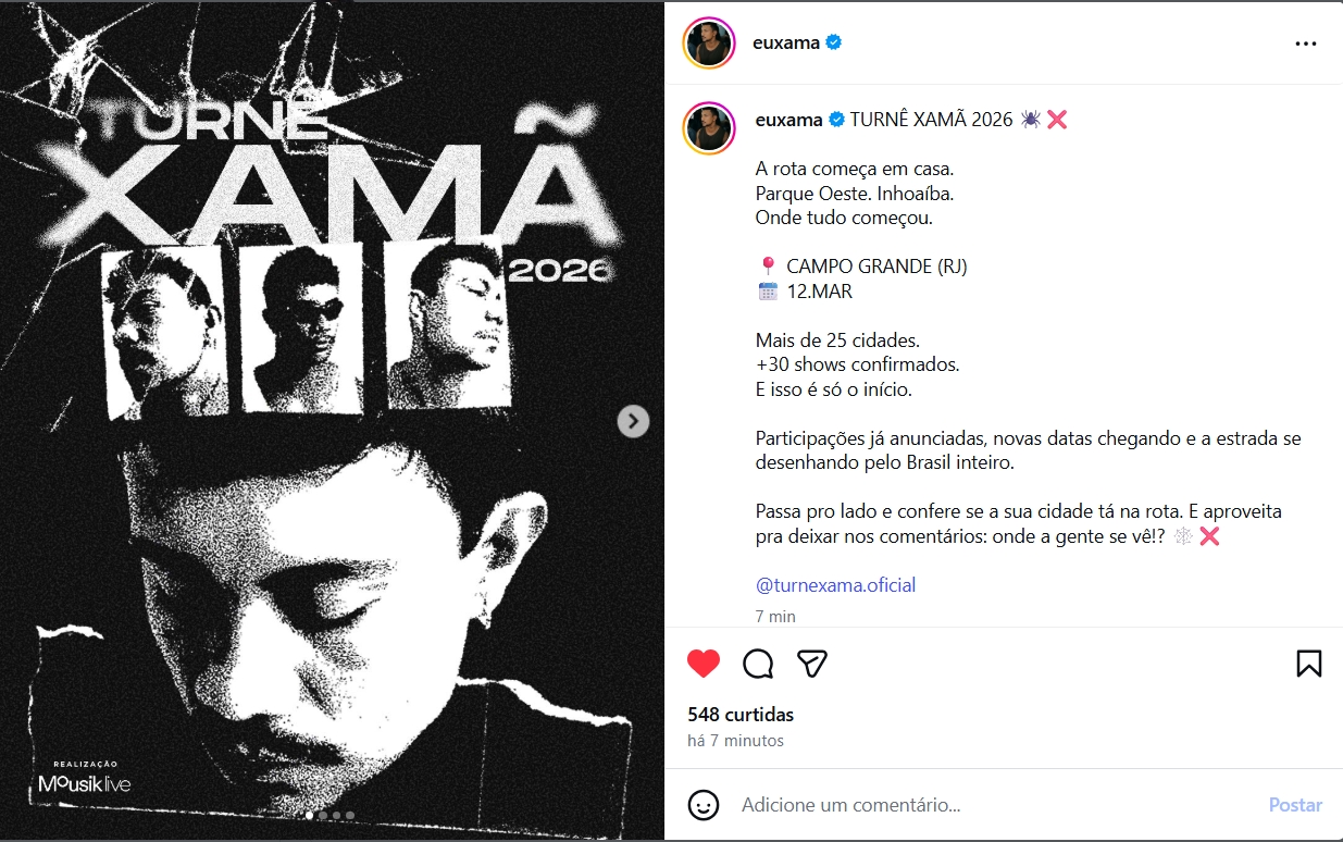 A Turnê Xamã 2026 foi lançada com um show gratuito em Campo Grande (RJ), bairro que marcou o início da carreira do artista — um gesto simbólico que celebra suas raízes e sua relação com o público.